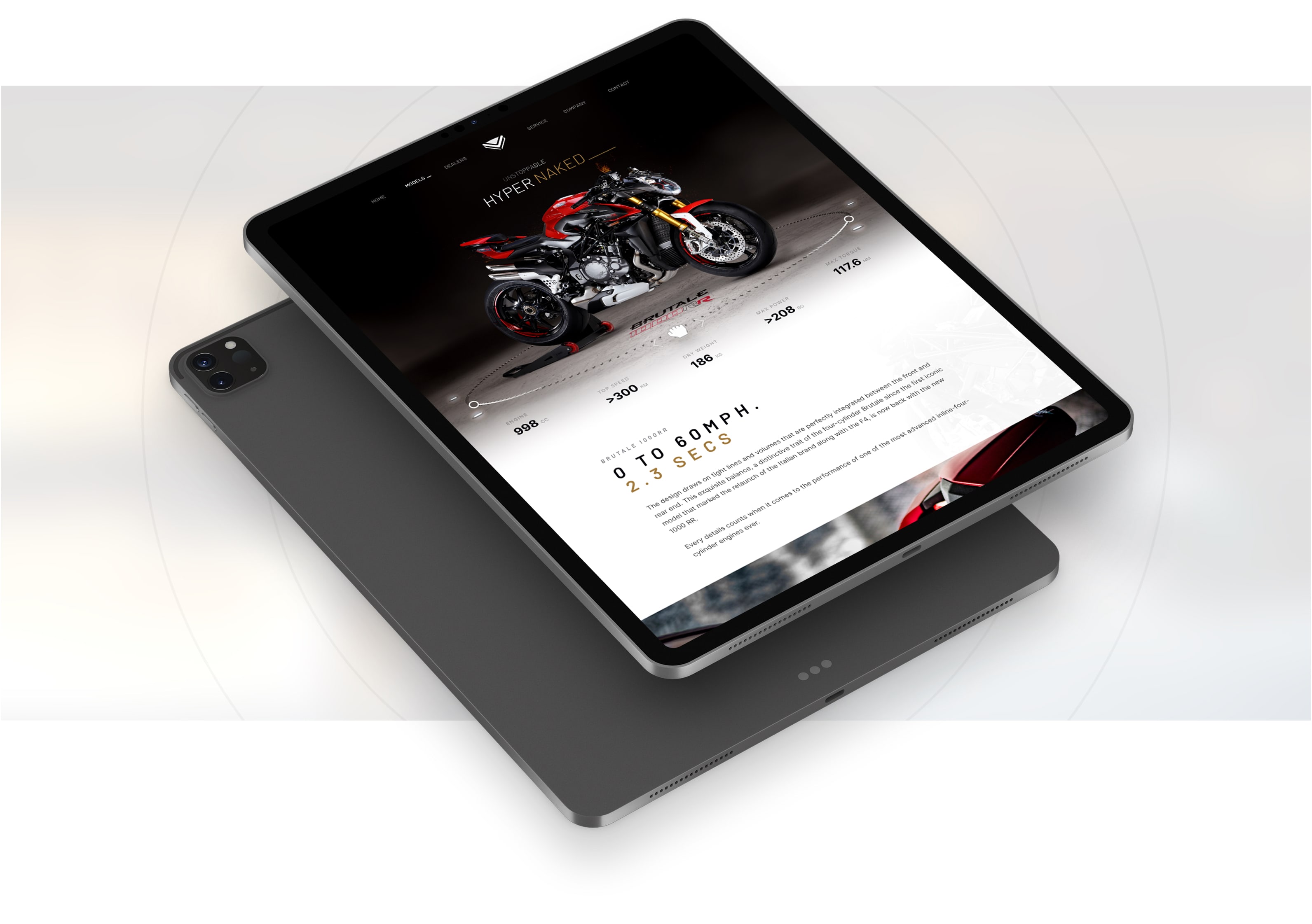 Bikes of the brand are exotic, premium level. So the model pages had to reflect the unique look and feel of the products. I’ve designed a 3d rotatable platform for the model page hero, combined with a specs information of the bike.